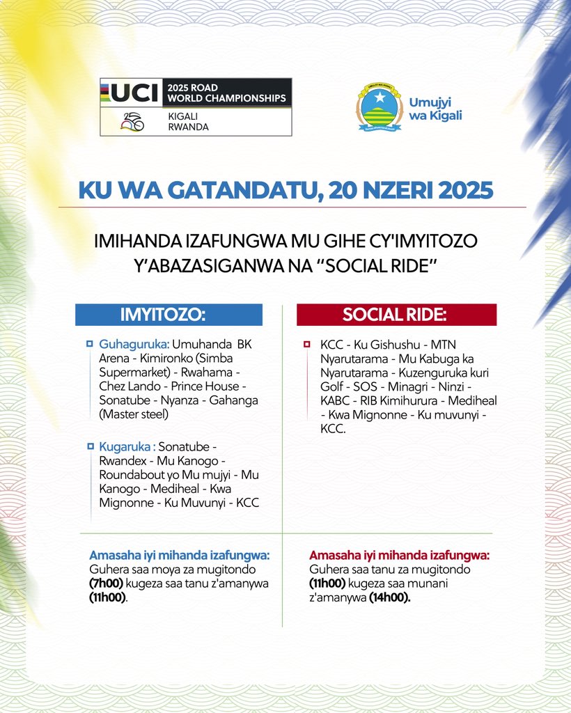 The morning session, from 7:00 AM to 1:00 PM, will take cyclists from BK Arena through Kimironko, Rwahama, and Chez Lando before heading south via Sonatube and Nyanza to Gahanga. The return route will pass through Rwandex, Mu Kanogo, and the city center, with the finish at the Kigali Convention Centre (KCC).