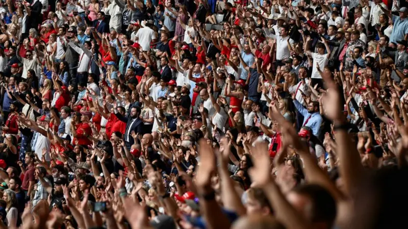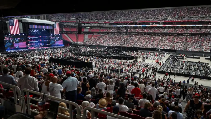 The atmosphere outside State Farm Stadium is more reminiscent of a political rally than a traditional memorial. Supporters have queued for hours, many wearing red, white, and blue outfits and Make America Great Again hats. Some carry religious slogans and posters featuring Kirk, while loudspeakers replay his speeches from trucks moving slowly through traffic.